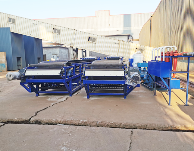 盤式真空過濾機(jī)是一種自動化程度極高的新型過濾設(shè)備。該機(jī)以濾布為介質(zhì),漿料由加料器均布在向前移動的濾布上,在真空推動力的作用下,濾液穿過濾布和膠帶吸引溝進(jìn)入真空箱,再由真空箱的排液孔進(jìn)入集液槽中回收或排放。濾布上的濾餅經(jīng)多次洗滌、抽干,在濾布轉(zhuǎn)向處進(jìn)入卸料處理,完成卸料之后濾布通過濾布洗刷裝置進(jìn)行再生。之后濾布通過一系列濾布托輥、濾布糾偏裝置,再通過進(jìn)料端組件上濾布壓輥,又重新覆蓋在橡膠帶之上進(jìn)入給料段、過濾、洗滌和抽干段,其操作過程是完全連續(xù)的。