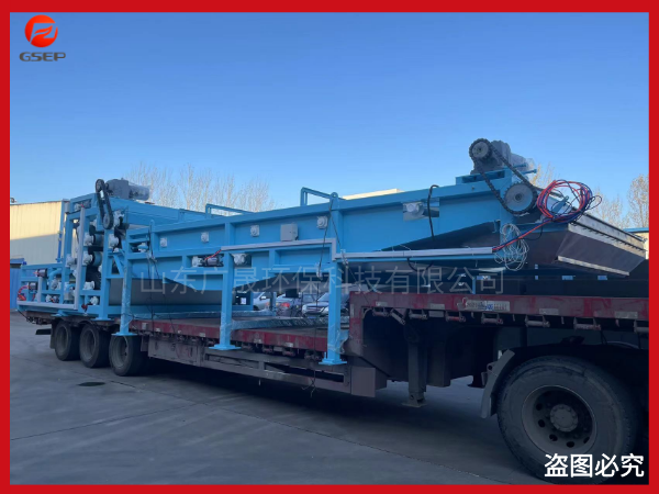 在重力的作用下自由水透過濾網(wǎng)背面而滲出分離,形成不流動(dòng)狀態(tài)的泥漿,達(dá)到壓榨脫水區(qū)實(shí)施較大壓力條件,然后隨著網(wǎng)帶的移動(dòng)而夾持在上下兩條網(wǎng)帶之間,經(jīng)過具有可調(diào)張緊力的過濾帶及直徑逐漸遞減的轉(zhuǎn)輥和對壓輥,實(shí)施連續(xù)增加的緩慢的對輥擠壓力、剪切力作用。