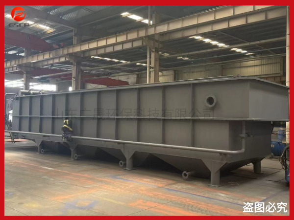 (2)氣浮機:經(jīng)加藥反應后的污水進入氣浮的混合區(qū),與釋放后的溶氣水混合接觸,使絮凝體粘附在細微氣泡上,然后進入氣浮區(qū)。絮凝體在氣浮力的作用下浮向水面形成浮渣,下 層的清水經(jīng)集水器流至清水池后,一部分回流作溶氣使用,剩余清水通過溢流口流出。氣浮池水面上的浮渣積聚到一定厚度以后,由刮沫機刮入氣浮機污泥池后排出,氣浮底部的淤泥定時間用抽糞車吸出外運,或者是打開排污閥自流入污泥收集池,用污泥脫水機脫水處理,從而減少二次污染,安全可靠。