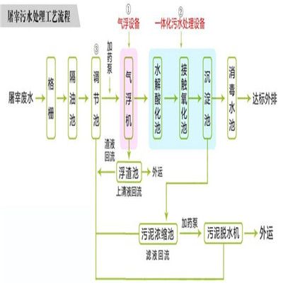 根據廢水的特性和對水的處理要求,廢水處理工藝需要采用物理化生化處理工藝. 廢水的CODcr色度高,油濃度很高,油附著在生物膜的表面,造成廢水和生物膜之間的接觸被阻塞,因此生化去除效率減少廢水中含有大量的畜毛,肉和骨頭. 碎屑,內臟殘渣,未消化的食物和糞便也不易生化. 因此,必須對廢水進行必要的預處理和物理化學處理,以使進入生物處理結構的懸浮固體和油脂含量降至zui低,然后進行生物化學處理,前端處理后,廢水中仍然包含大部分高分子有機污染物,因此需要進一步降解為小分子物質,以準備后續的好氧生物化學,并考慮氨氮量和廢水中的磷,須裝備好氧-缺氧,交替操作環境以實現硝化-反硝化作用,以達到脫氮除磷的作用. 在此,通過設置水解酸化槽,將之后的好氧處理水部分地回流至水解酸化槽. 廢水通過水解酸化池后,進入需氧池.在此,好氧罐分為兩個部分. 優勢在于,在不同的好氧區域中,微生物會根據不同的環境在空間上分布,并且具有針對性的去除效果.在前端通過各種生化處理設備處理廢水后,有機污染負荷大大降低。 但是,廢水中的色度仍然難以達到標準. 為了去除色度并考慮減少COD以及減少氨氮和總磷,在此設置了一個凝結沉淀池并添加了目標試劑. 沉淀池從水中出來,進入消毒池,然后達到zui終的排放標準.
